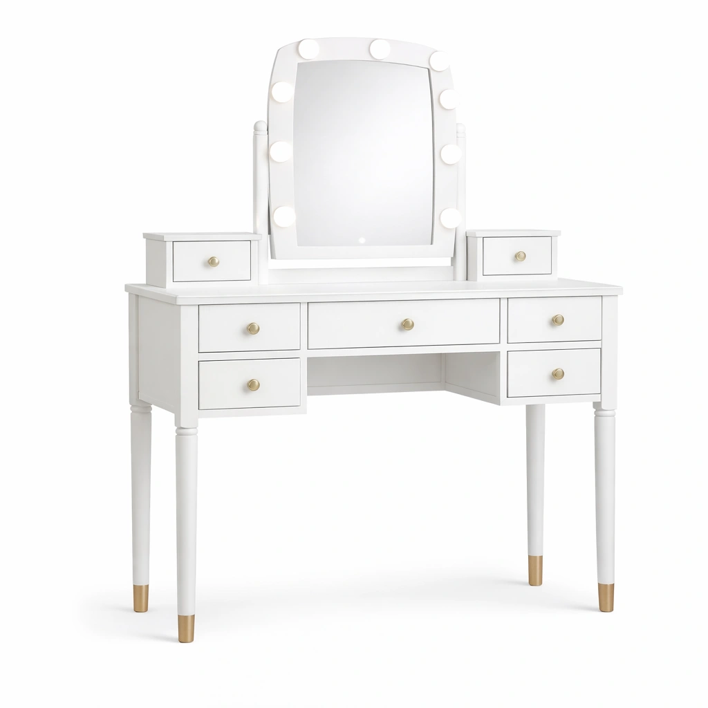 La coiffeuse est fabriquée en bois d'hévéa et MDF, offrant une structure robuste. Elle est équipée d'un miroir en verre trempé de 4 mm avec éclairage LED intégré, adapté pour une utilisation intérieure. La coiffeuse comprend sept tiroirs en MDF pour un rangement pratique des articles personnels. Les poignées sont en alliage de zinc.