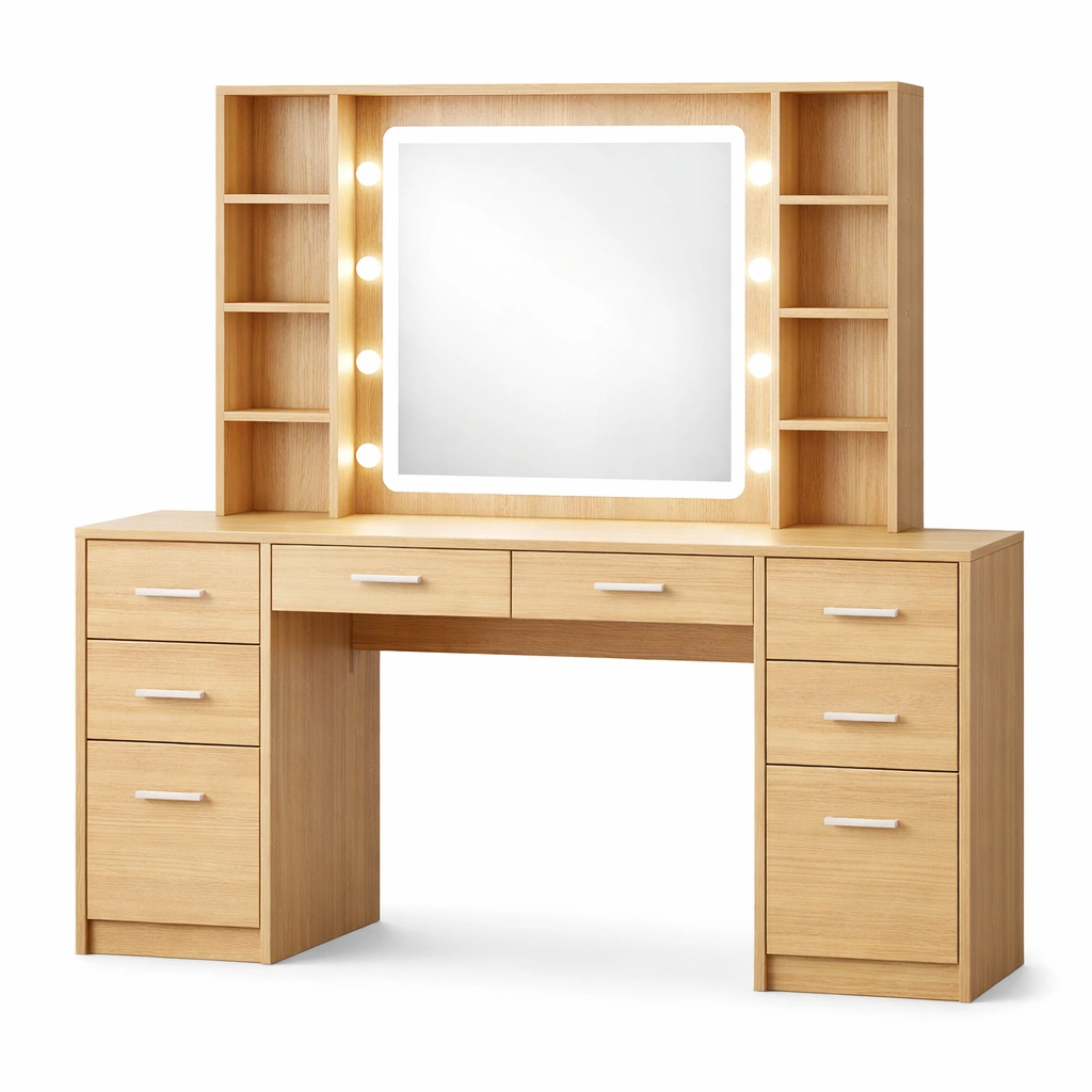 Coiffeuse en bois clair avec miroir LED et rangements