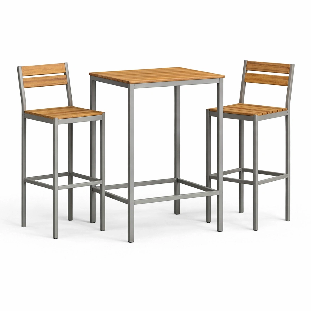 Ensemble comprenant une table haute et deux chaises de bar.